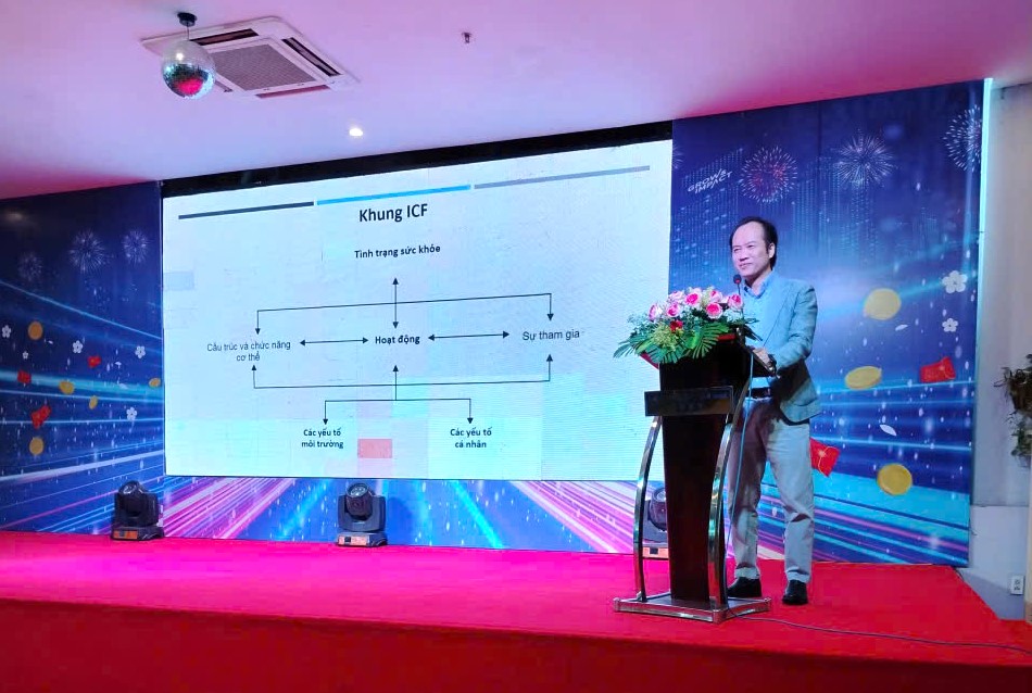 MSc. Dr. Ha Chan Nhan, Head of the Department of Rehabilitation, Hue University of Medicine and Pharmacy, presenting on the ICF in Quang Tri province on August 16.