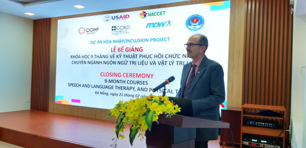 Certificates of the OT course conferred to the graduates.Mr.Anthony Kolb, Deputy Director of USAID’s Reconciliation and Inclusive Development Office, gives his speech at the PT&SALT course closing ceremony.(From the right) Representatives of MCNV, CCIHP, Da Nang UMP and CCRD at the closing ceremony of the PT and SALT courses.