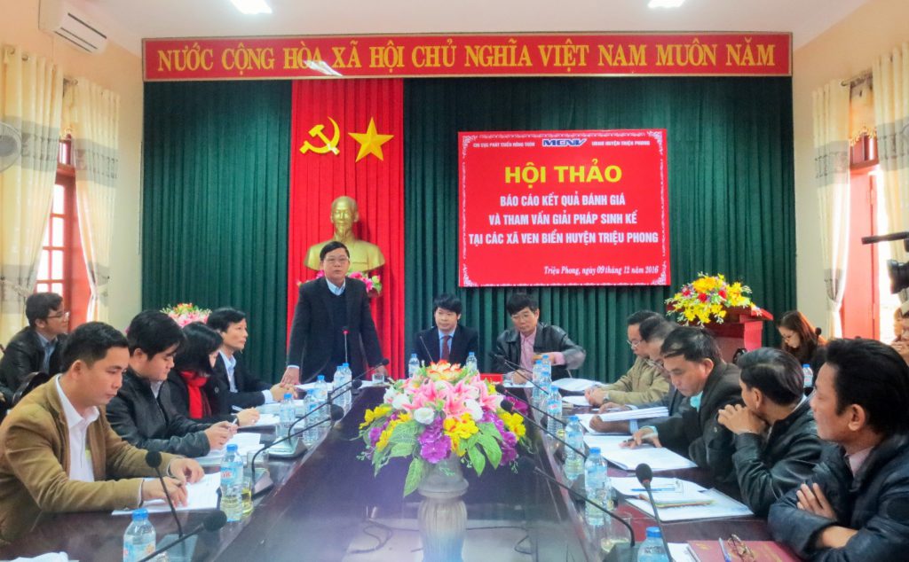 Ngày 9/12/2016, tại UBND huyện Triệu Phong – tỉnh Quảng Trị – đã diễn ra Hội thảo báo cáo kết quả đánh giá và tham vấn giải pháp sinh kế tại các xã ven biển huyện Triệu Phong chịu ảnh hưởng bởi sự cố ô nhiễm môi trường biển gây cá chết hàng loạt, xảy ra vào tháng 4/2016.